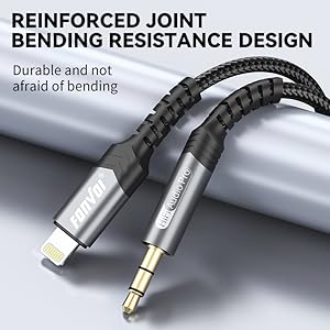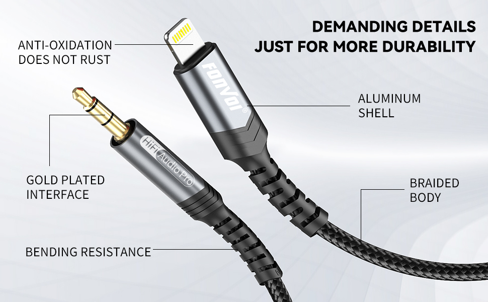 Lightning plug for aluminum reinforcement, 3.5mm for gold-plated plug, so you audio lossless transmission. Nylon braided cable can greatly extend the use of life.