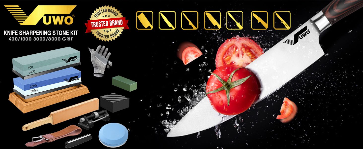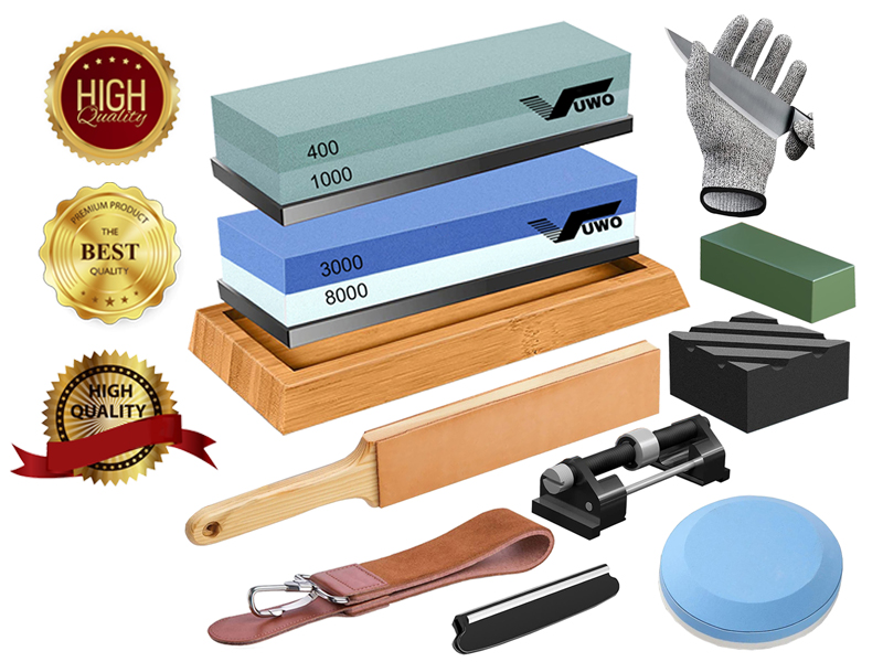 vuwo Knife Sharpening Stone Kit - Whetstone Dual Grit 400/1000 3000/8000 Premium Sharpener Set with Leather Strop, Flattening Stone, Honing Guide, Bamboo Base, Angle Guide